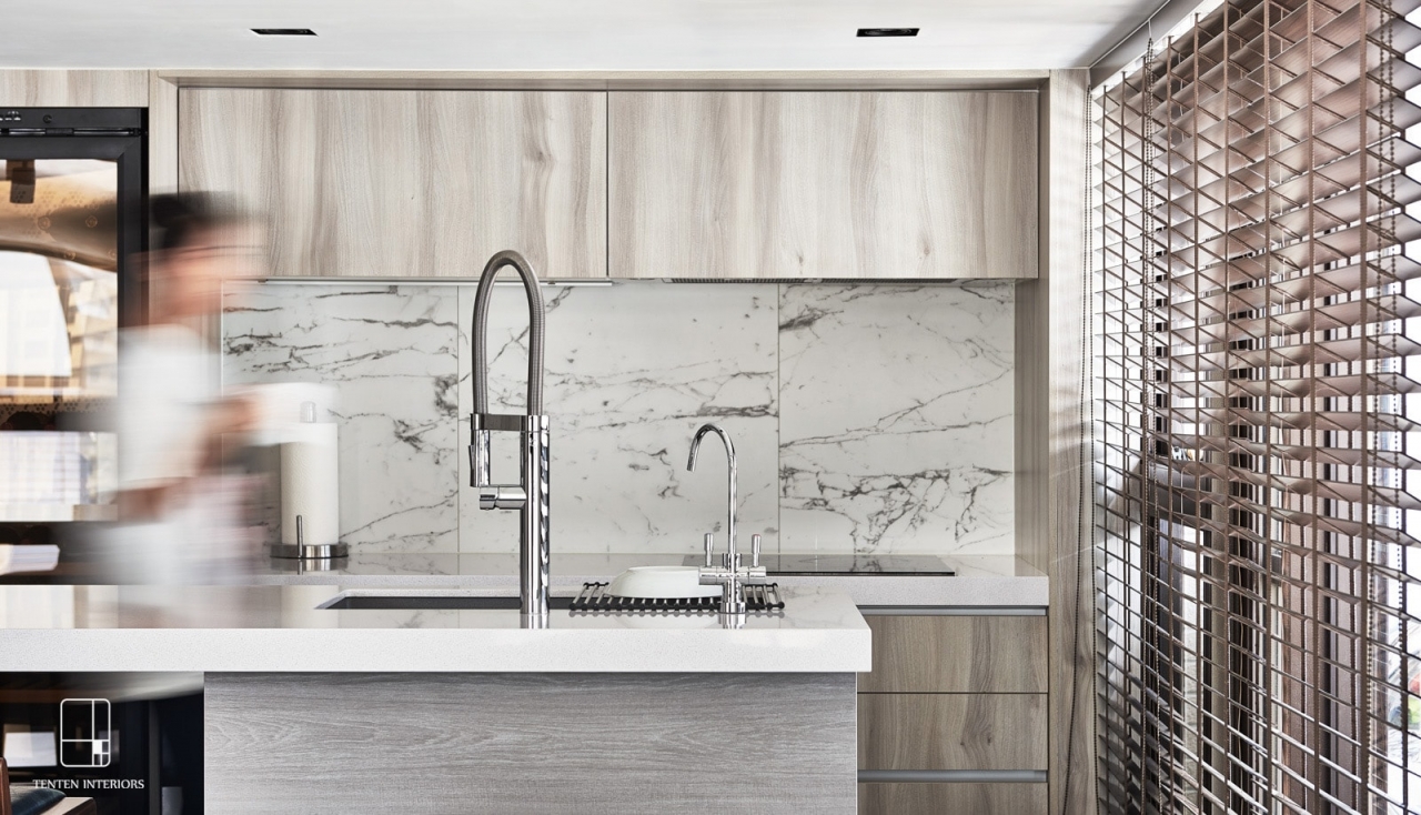 以現代與人文靈魂規劃出空間價值與精神所在。客廳除了主人閱讀區域之外,更設計有書櫃、臥榻區,強調舒適機能的完整規劃。而一襲沉穩典雅的石材牆面與對向的胡桃木展示高櫃,取得視覺得最佳平衡,而電視櫃材質延伸自上方石材壁面,呈現波浪型,跳躍不失和諧、突出亦比例。 整體以中性以及大地色調為鋪陳,減少過多華麗的鋪陳,以材質的紋理與色彩展現出空間質感。天花板展現出簡約與氣度兼具的質感,而牆面展示空間創造豐富卻井然有序的立面處理,溫暖的木皮牆面穿透客餐廳空間,讓視線在場域中流連。