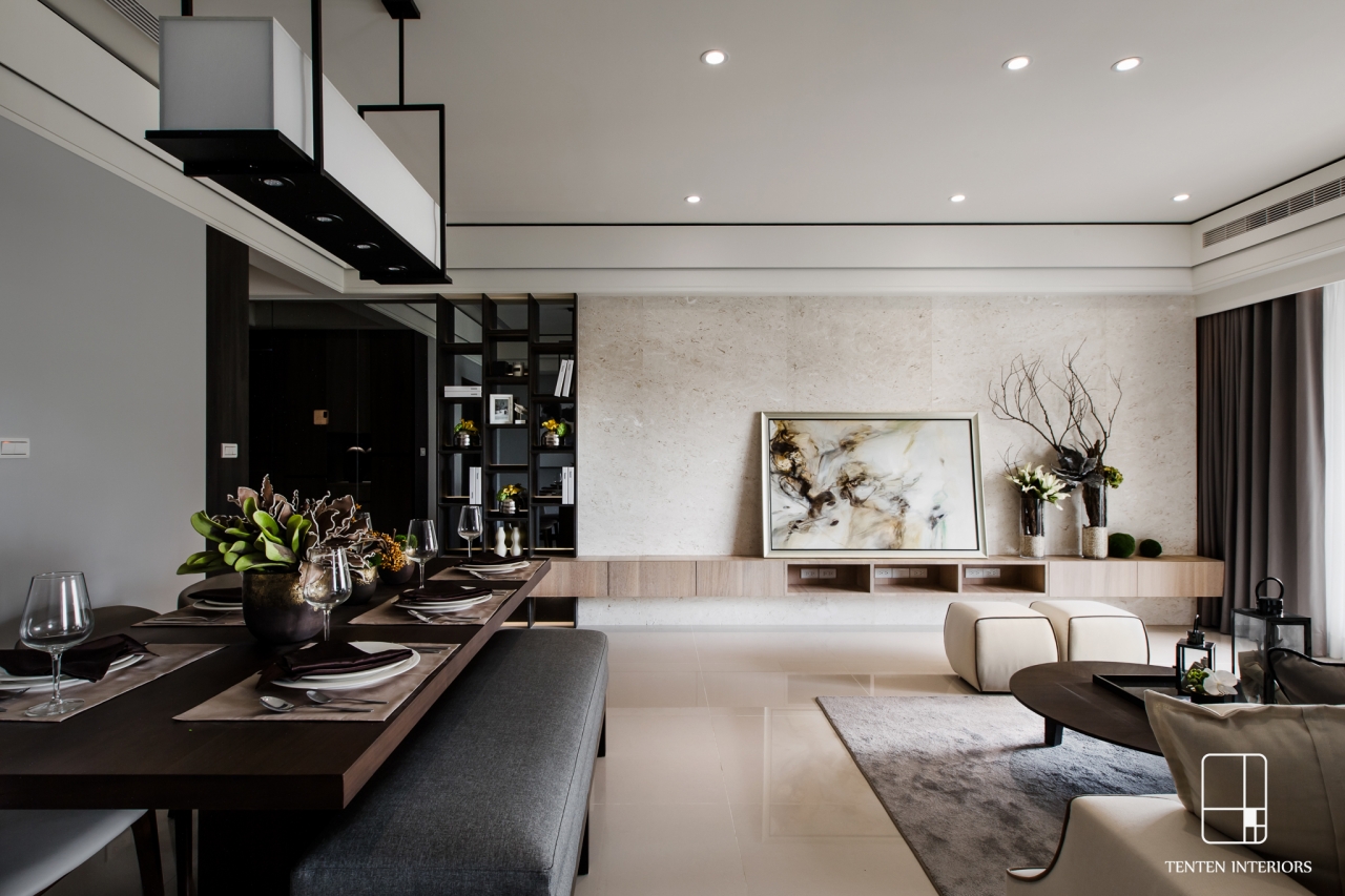 象灰冷色基調,大片石材紋路的電視牆,使公共空間充滿人文高雅情懷。極簡幾何線條穿透,不論窗格、燈飾鐵件,抑或門片溝縫,不多文飾妝點,以俐落線性流動,喚出空間的延伸感。更輔以大片玻璃取代實牆作為隔間,使光源相互流通,也擴大公共空間的穿透感,讓象灰色調提亮,增加舒適寬敞的視覺感受。 延續公共空間的基調,書房以木質駝色、軟質沙發元素,增加溫度;架高底座的窄型書架設計,讓小坪數書房多了變化性與喘息空間,使大片木座書架系統不致於產生沈重視覺。主臥與次主臥主要規劃為屋主睡房及孝親房使用,採用主基調的灰,帶入木質、繃皮及絲綢材質的布面,增添柔和表情。小孩房一別整體去飽和色調,色彩明亮鮮明,極簡的層架設計,以及大量床底、置物櫃等收納規劃, 實用又極具活潑巧思